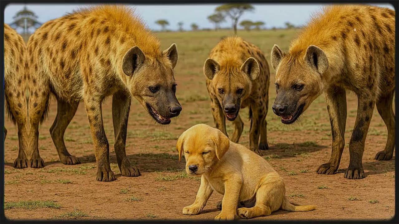 The puppy whimpered, a thin sound swallowed by the vast grassland. Alone and outmatched, he crouched low, heart thutting like a drum. The hyenas moved closer, still, their shadows merging until it seemed the daylight itself might be swallowed. One more step, and the circle would close completely. The little puppy’s chest heaved with quick, shallow breaths.