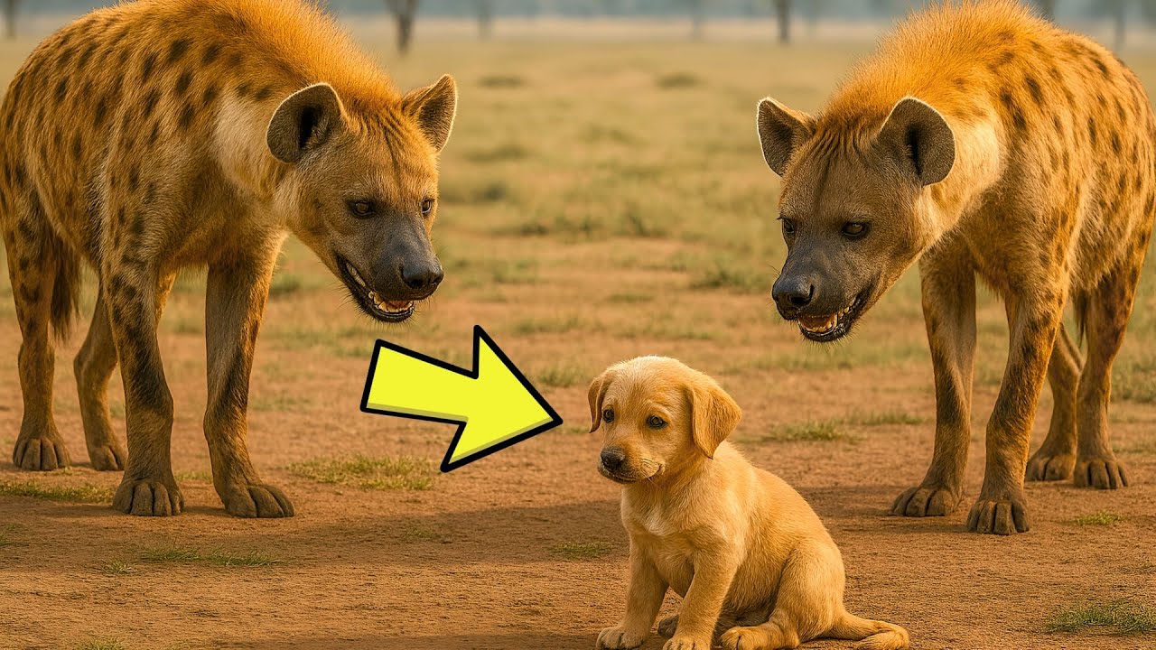 In the heart of the African savannah, a tiny golden puppy wandered alone, nose to the ground, unaware of the danger creeping closer. From the tall grass emerged dark shapes, hyenas, their eerie laughter rising like a warning. The circle titan, teeth flashing in the sun. Just when it seemed too late, an unexpected hero thundered across the plane.