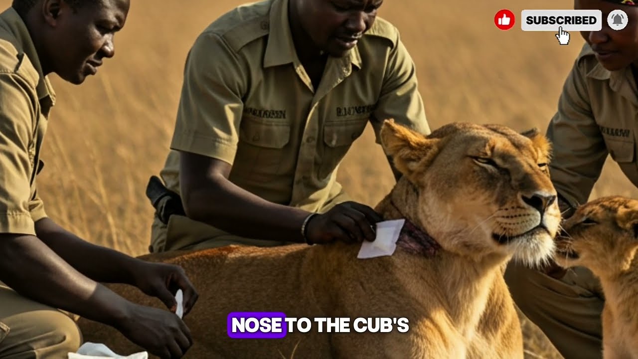 Bandages pressed against the wound, antiseptic scent mixing with the hot dust. The cub rushed over, pressing its cheek against her neck, purring faintly. Time passed. The shadows stretched long. Then her eyes flickered. Her tail twitched. She slowly woke. The cub nuzzled her face, whining with relief. The lioness touched her nose to the cub’s forehead, licking it softly, a thank you, not just to her cub, but to the strangers watching from a distance.
