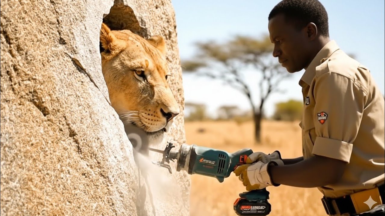 Then a heavy chunk broke loose, opening a gap wide. Carefully they checked the wound. Blood trickled from the lioness’s neck, but it wasn’t deep. They cleaned it, wrapped it tight, and counted down. 1 2 3. Together, they pulled. Her body slid free. They laid her gently on her side, propping her head on a rolled bag.