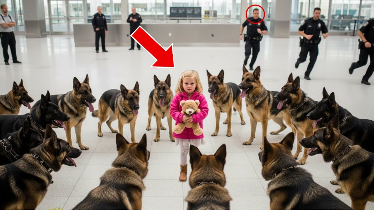 She was just a little girl in a pink jacket standing alone at the airport until 14 police dogs suddenly surrounded her. Passengers screamed, officers froze, and then one dog lunged. What they found next left the entire terminal in stunned silence.