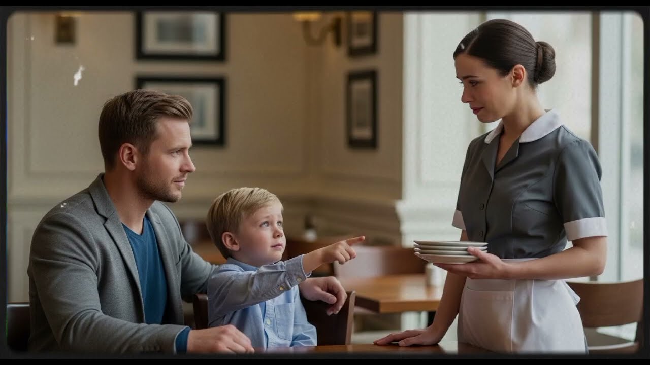 The restaurant fell silent the moment the little boy’s voice broke through the gentle hum of lunch hour chatter. His small hand pointed toward the young woman standing by their table. Her head bowed, her trembling hands clutching a tray of plates. The father turned in confusion, his brows furrowed, wondering what his son had just said that made the air so heavy, so still.