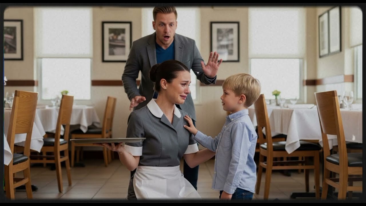 As Emma cleared the table beside theirs, a tray slipped from her hands and crashed to the floor. The sound startled the boy. Without thinking, Ethan jumped from his seat and ran to her side. And then in a voice that carried through the restaurant, he said the words that changed everything. Don’t cry, Mommy. It’s okay.