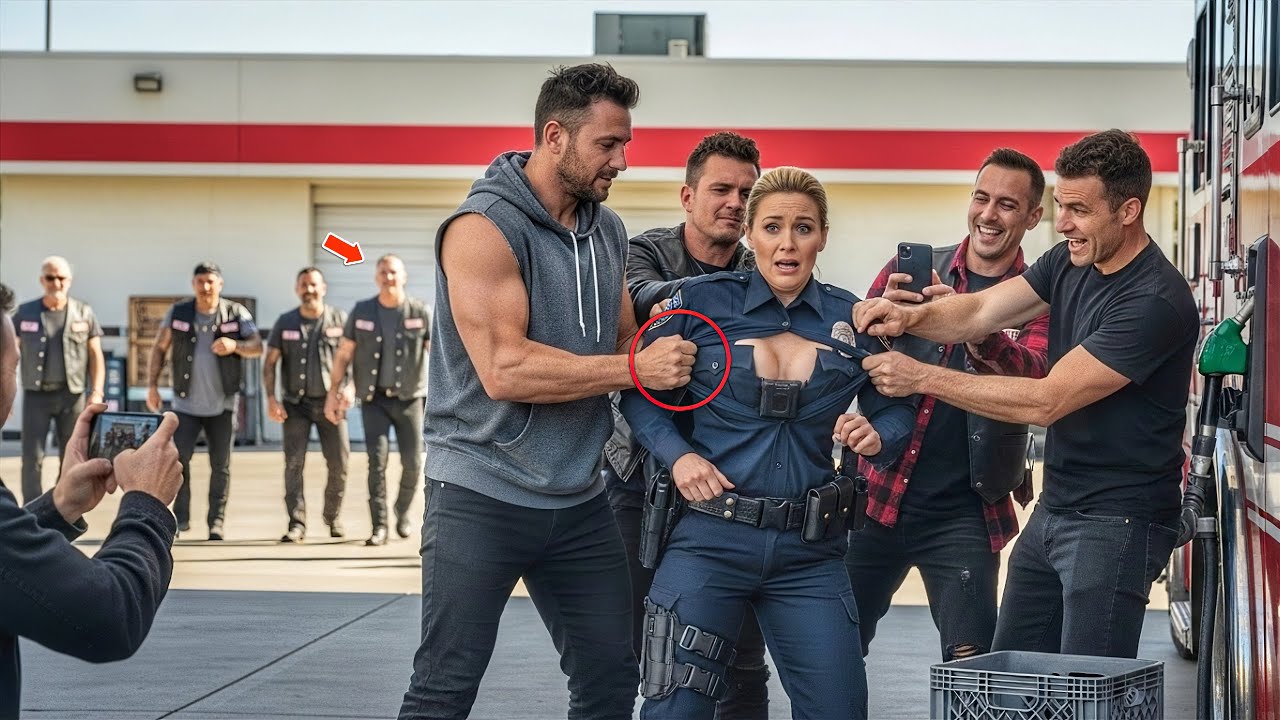 The sound of tearing fabric and suppressed laughter filled the still air behind the gas station. The sun was bright, merciless, glaring down on a scene no one should have to see. Officer Mara Collins stood with her back against the wall, her pulse pounding in her throat, her uniform being ripped apart by two men who thought they owned the world because no one had stopped them yet.