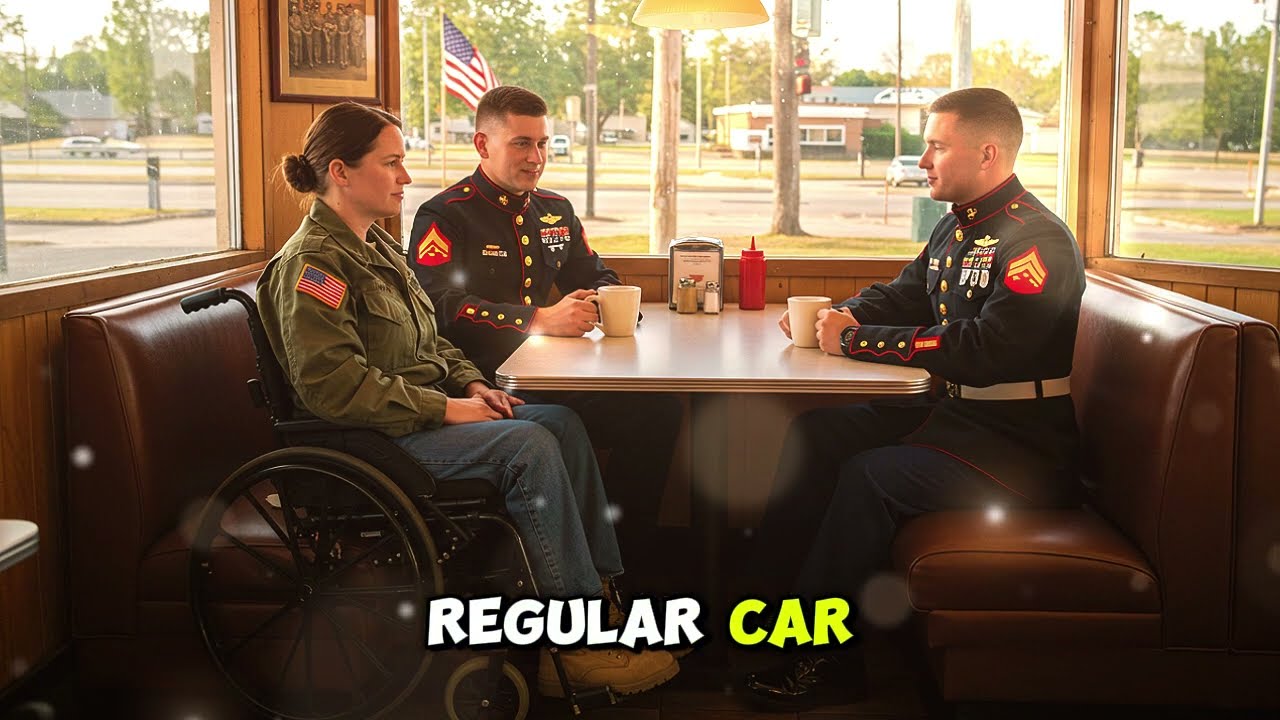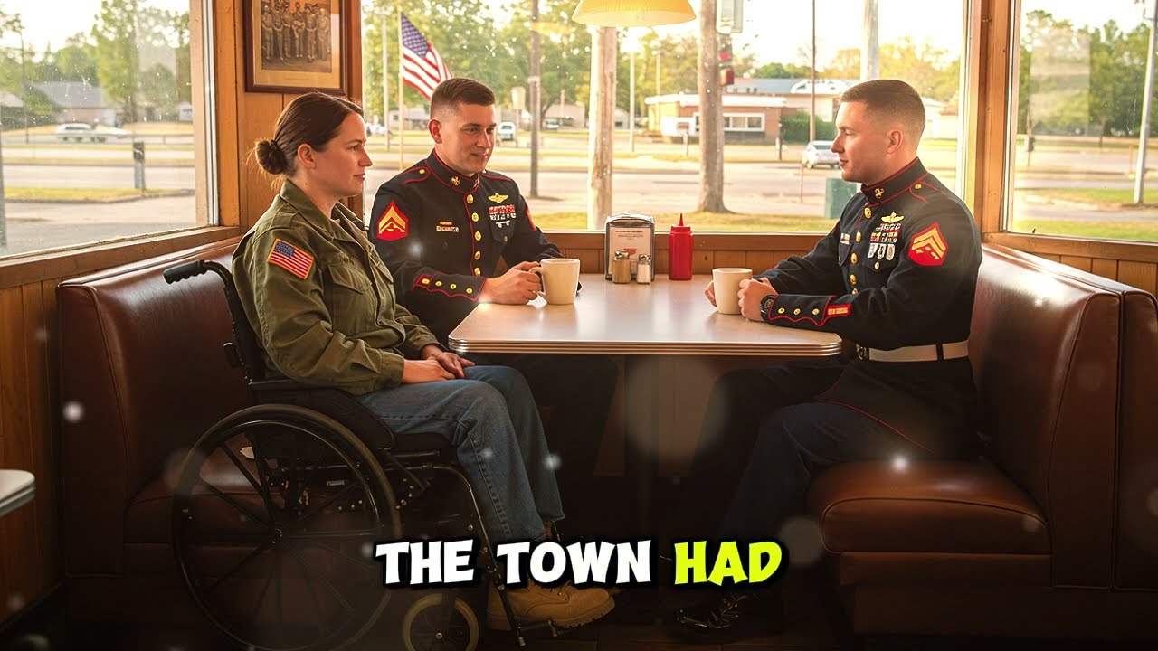 His cap was clutched tightly in both hands, his eyes wide and unsure. He stood there like he wasn’t sure if he belonged. Grace noticed him immediately. She wheeled herself forward without hesitation, her flag patch catching the warm glow of the setting sun through the diner windows. “First deployment?” she asked softly.