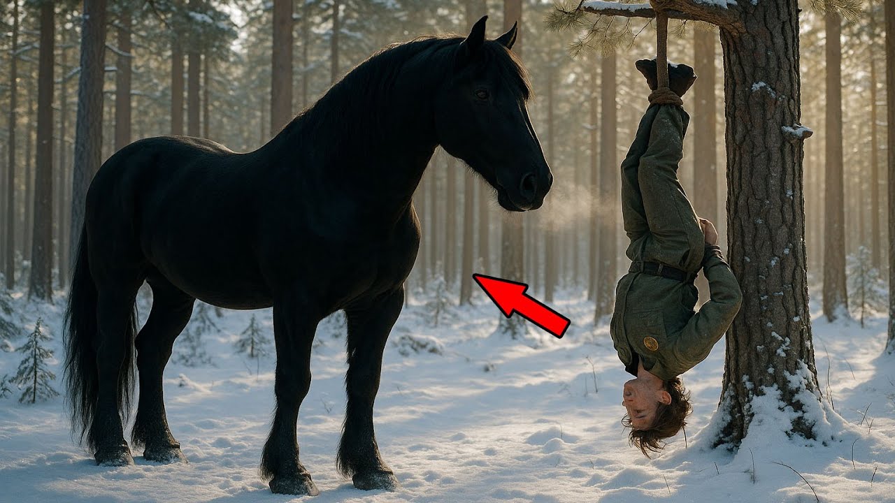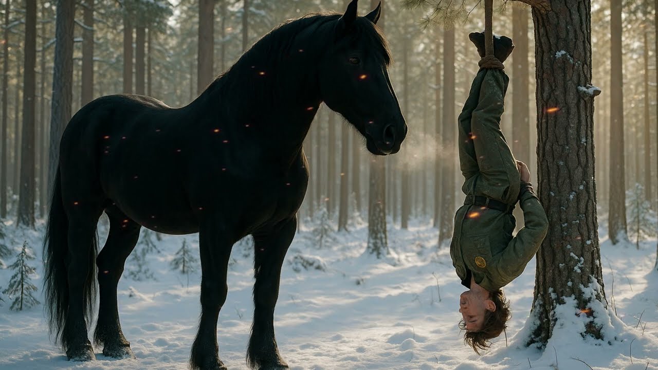 Her arms dangled uselessly, blood pounding through them, her wrists burning against the ties. But her instincts screamed caution. Even in her delirium, she knew what a Mustang could do with a single well-placed kick. Yet the stallion’s movements weren’t aggressive. They were calculated curious. It lowered its massive head nostrils expanding as it drew in her scent, ears swiveing with constant alertness.