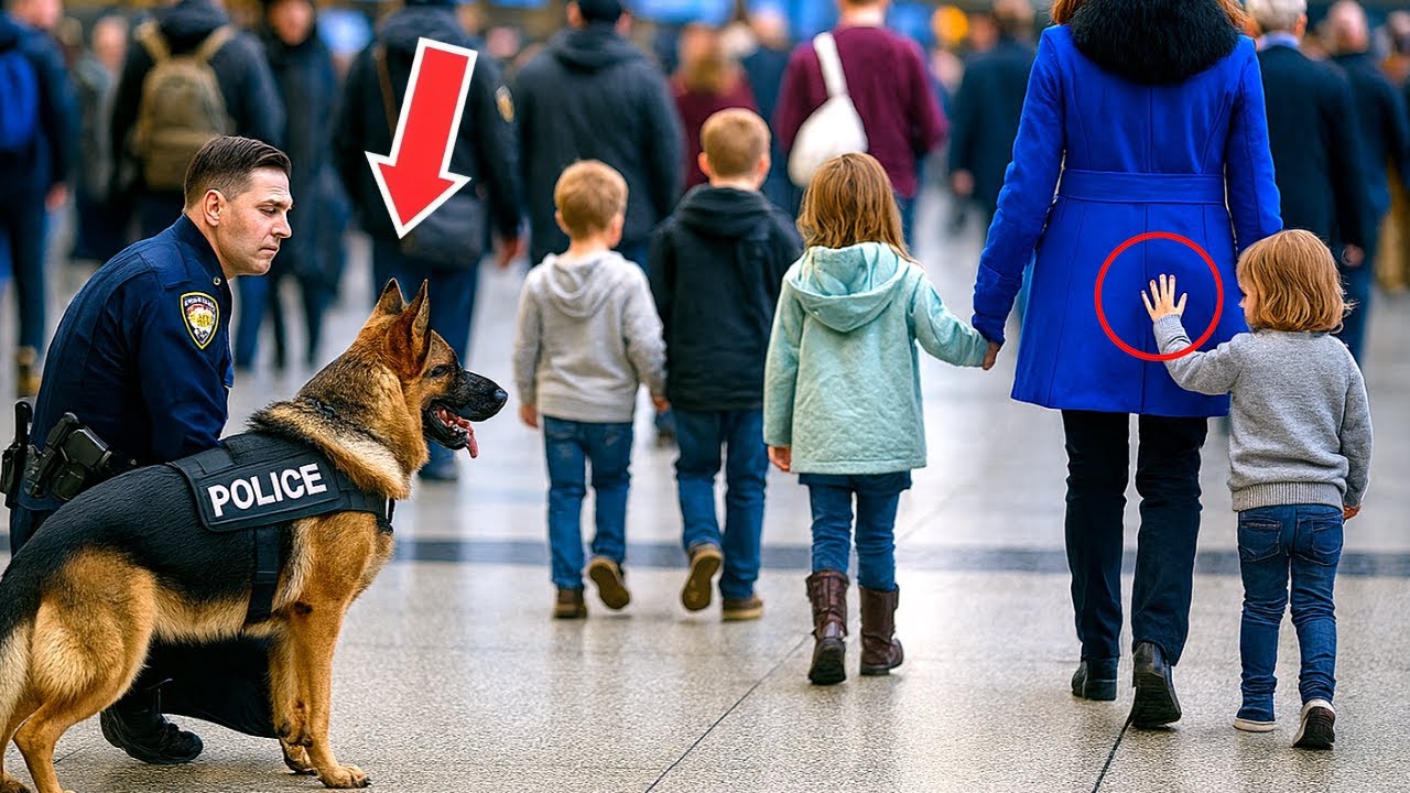 The German Shepherd’s head turned slightly as he observed people passing, a routine check for anything unusual. Near the security checkpoint, Mark’s gaze caught a woman in a bright blue coat, walking hand in hand with three children. She seemed calm, almost too composed, moving swiftly, as if eager to disappear into the crowd.