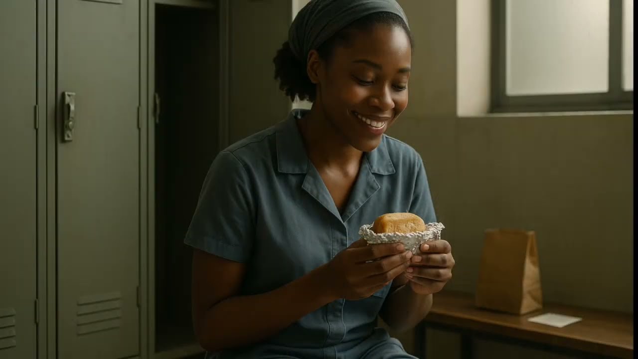 Just get through today. Around noon, she went behind the building to eat her small lunch. A piece of bread and bottled water. She sat alone on a crate, her fingers trembling as she unwrapped the food. Then a man walked past the hotel entrance and stopped. It was Ethan, dressed casually, wearing a cap and sunglasses. He pretended to check his phone, but his eyes were on her.