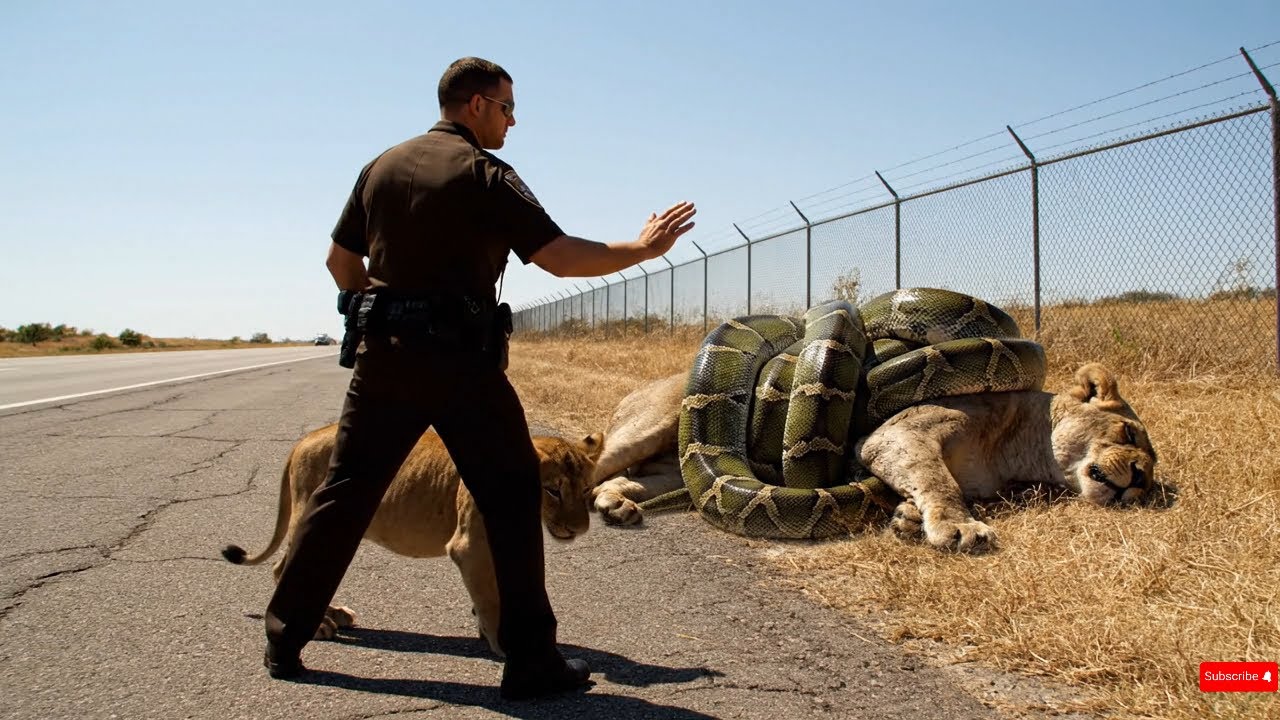 The wilderness often intersects with the constructs of human civilization in unexpected and sometimes terrifying ways. For those who patrol the remote stretches of asphalt cutting through vast, untamed landscapes, every shift holds the possibility of encountering nature at its most raw. Yet, what unfolded on a seemingly ordinary afternoon along the quiet lanes of Highway 101 defied all expectations, pushing the boundaries of what local law enforcement and specialized wildlife responders were trained to handle. It was a heart-stopping, visceral struggle for life, a confrontation between two titans of the wild, and a race against the clock where the fate of a mother lioness hung in the balance, slowly being extinguished by the merciless, constricting power of a massive python.