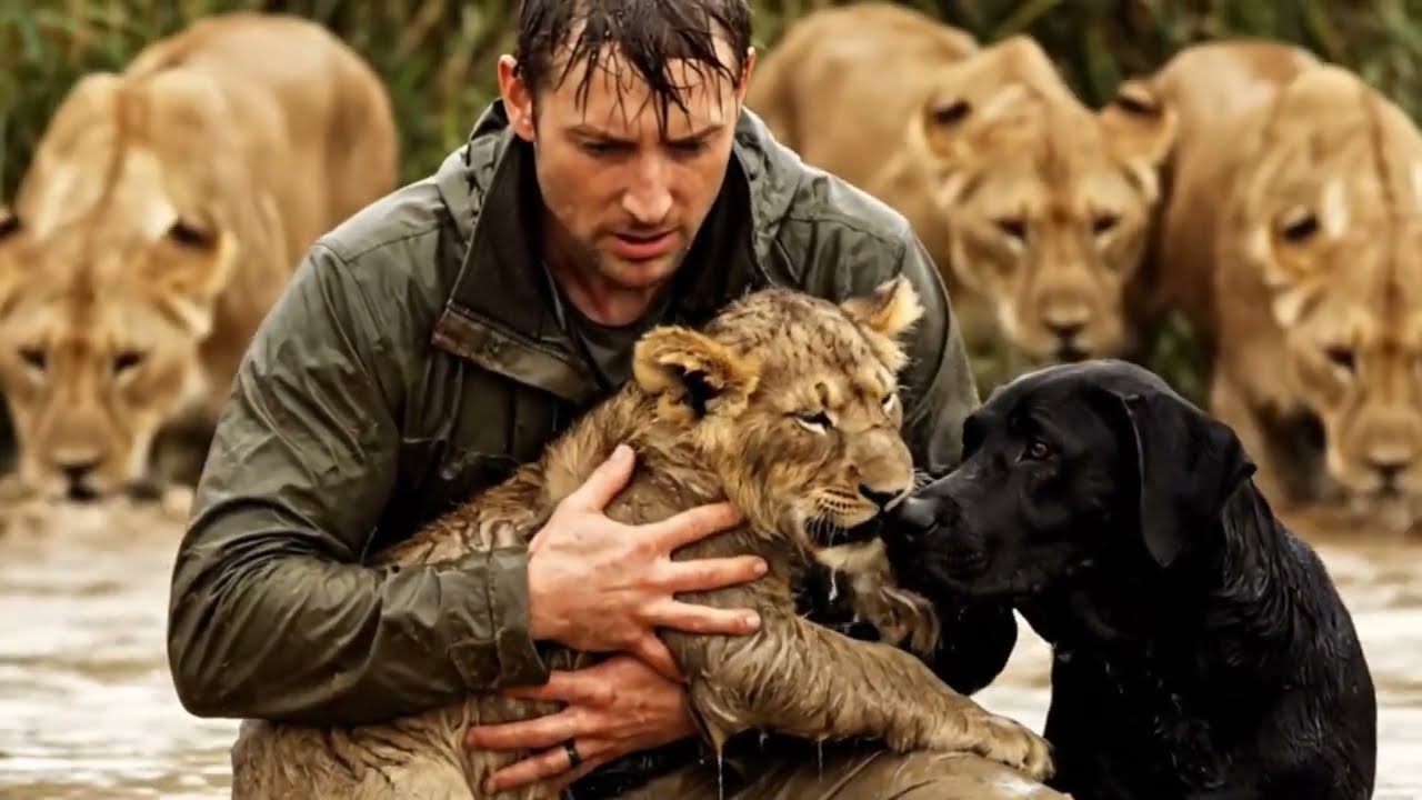 But the roar never came. The silence remained, a pregnant, charged void where violence should have been. The lions paused, their eyes locked on the exhausted human holding the soaked cub, and the dripping, trembling dog on the roots.