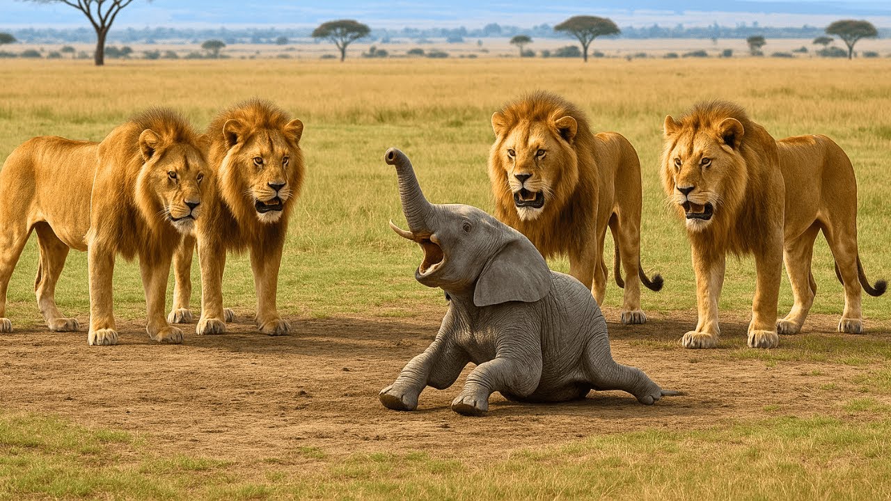 Neo, overwhelmed by the sheer, terrifying presence of a dozen eyes burning into him, stumbled backward, his small body pressing desperately against a low mound of earth. His trunk flailed uselessly, a pitiable gesture of defense. His small legs, engineered for following his mother’s mighty strides, now trembled uncontrollably, seized by absolute terror. He let out a piercing cry, a sound that spoke of pure, unadulterated fear—a final, despairing shriek directed at a world that had betrayed him. The lions responded by closing the gap. One predator crouched low, a coiled spring of muscle, ready to deliver the killing blow. Another flanked him expertly from the side, meticulously cutting off the last sliver of possible retreat. Twelve against a single calf. The mathematics of survival offered zero hope. The savannah itself seemed to hold its breath, waiting for the inevitable, for the moment the laws of the wild would be enforced.
