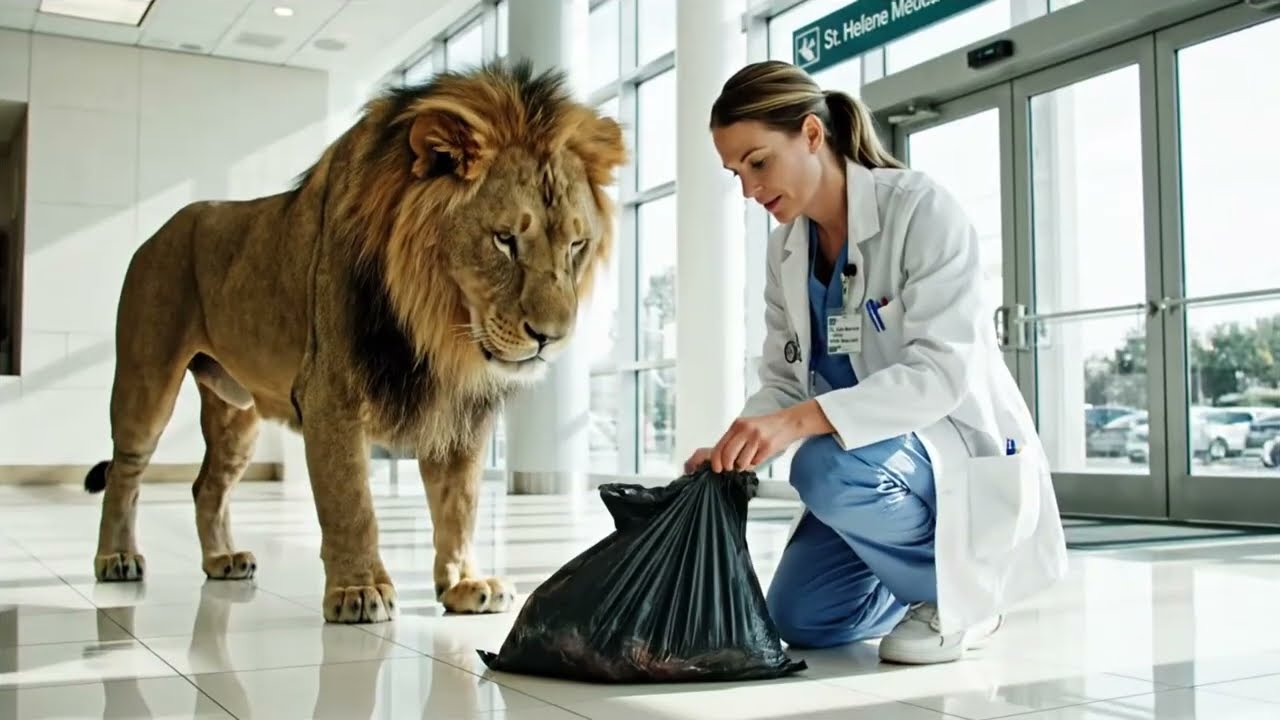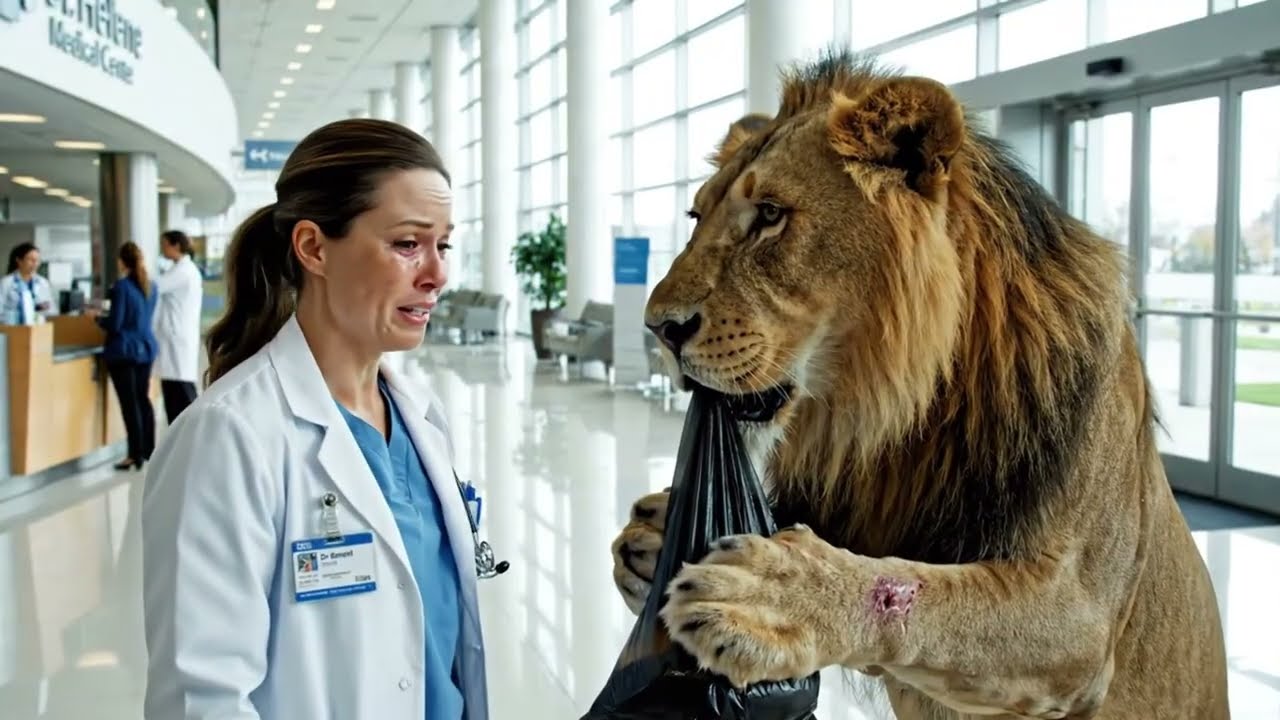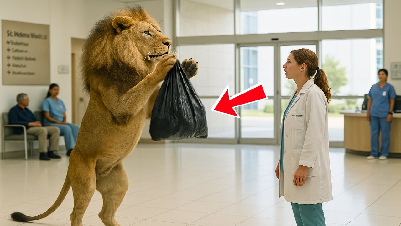 For a suspended second, the entire hospital held its collective breath. No one dared move, bound by a primal fear that transcended logic. Then, the inevitable human response—a shouted warning, “Get back!”—pierced the silence. But the command was useless. The lion did not roar. He did not lunge. He made no movement to defend or attack. He simply walked forward, slow and heavy, a measured, deliberate pace that suggested immense physical exertion and focused intent. The black bag swayed gently with each deep, shuddering breath the animal took, a pendulum marking the strange passage of this impossible moment.