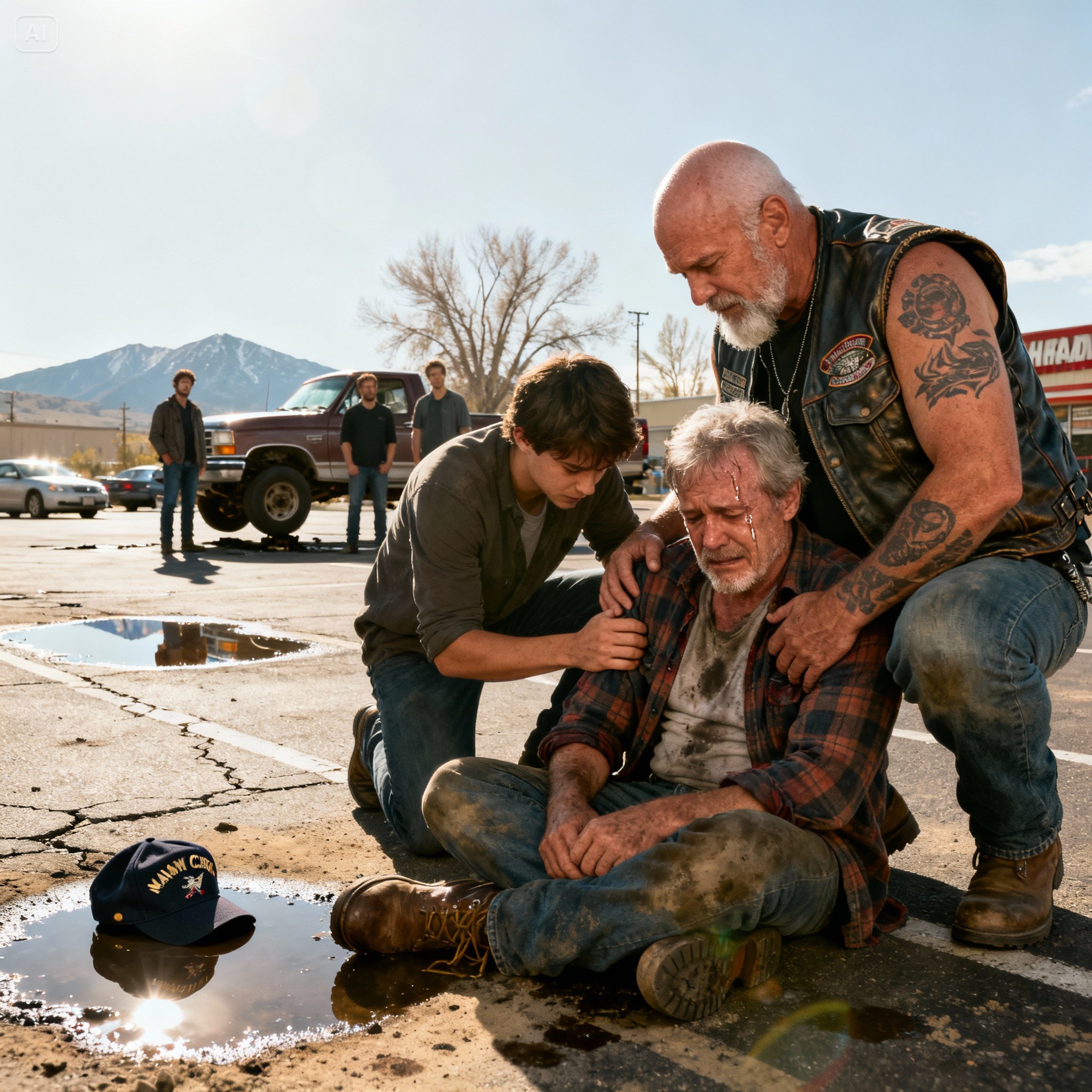 The bell above the hardware store door didn’t just chime—it screamed as a little boy burst through, his face a mess of dirt and tears. “Please, somebody help!” he sobbed, his small voice cracking. “They hurt my grandpa!” He pointed a trembling finger toward the parking lot, where an old man lay crumpled between two cars. His walking cane was snapped in two beside him, a lonely testament to a fight he never should have had to face.