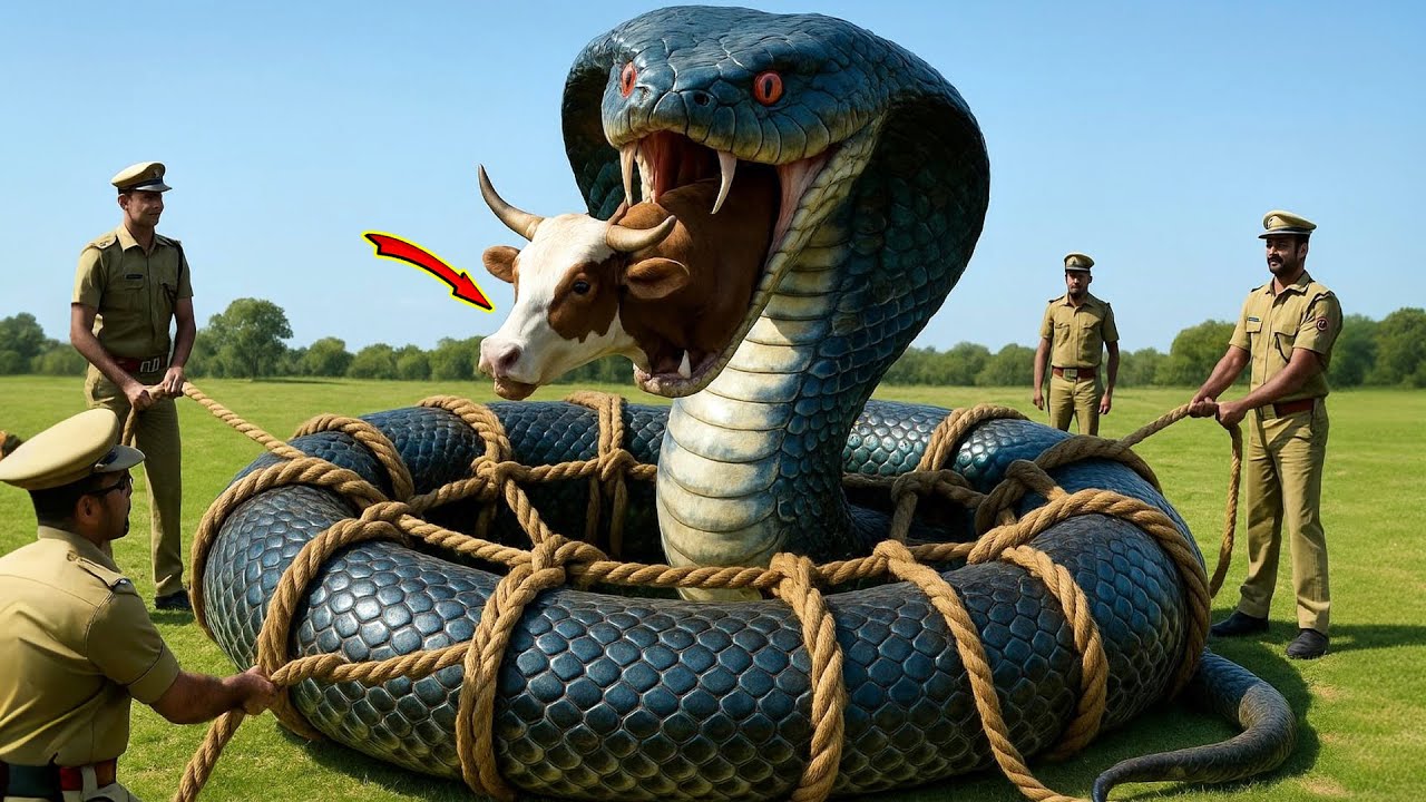 The peace of the morning was shattered not by a sound, but by a chilling silence—a silence heavy with the ancient, raw tension of a predator’s hunt. In a small farming village nestled on the edge of a dense, tropical forest, a terrifying spectacle was unfolding. A domestic cow, a beloved part of a family’s livelihood, stood paralyzed by fear, mere feet from the lethal, raised head of a serpent of mythical proportions: a massive King Cobra. This was not a quick skirmish; it was a desperate, hour-long standoff, a real-life David versus Goliath where a heroic, dedicated team would have to risk their own lives to rewrite the ending.