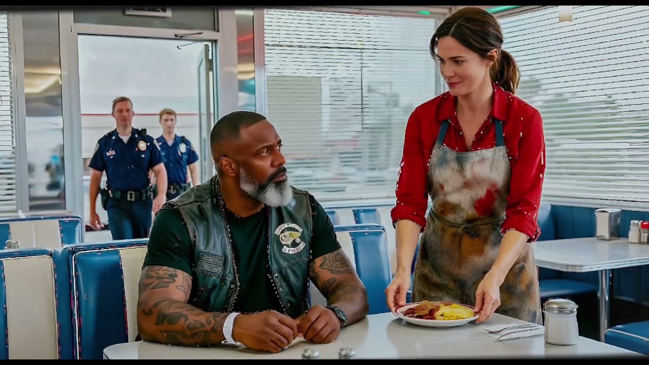 Emily, trusting her instincts, approached with a soft smile and asked what he’d like. He simply nodded and said, “Whatever’s hot.” Minutes later, as Emily placed a steaming plate of food before him, two police officers entered the diner, their radios crackling, eyes immediately locking onto the biker. The tension was instant, electric.