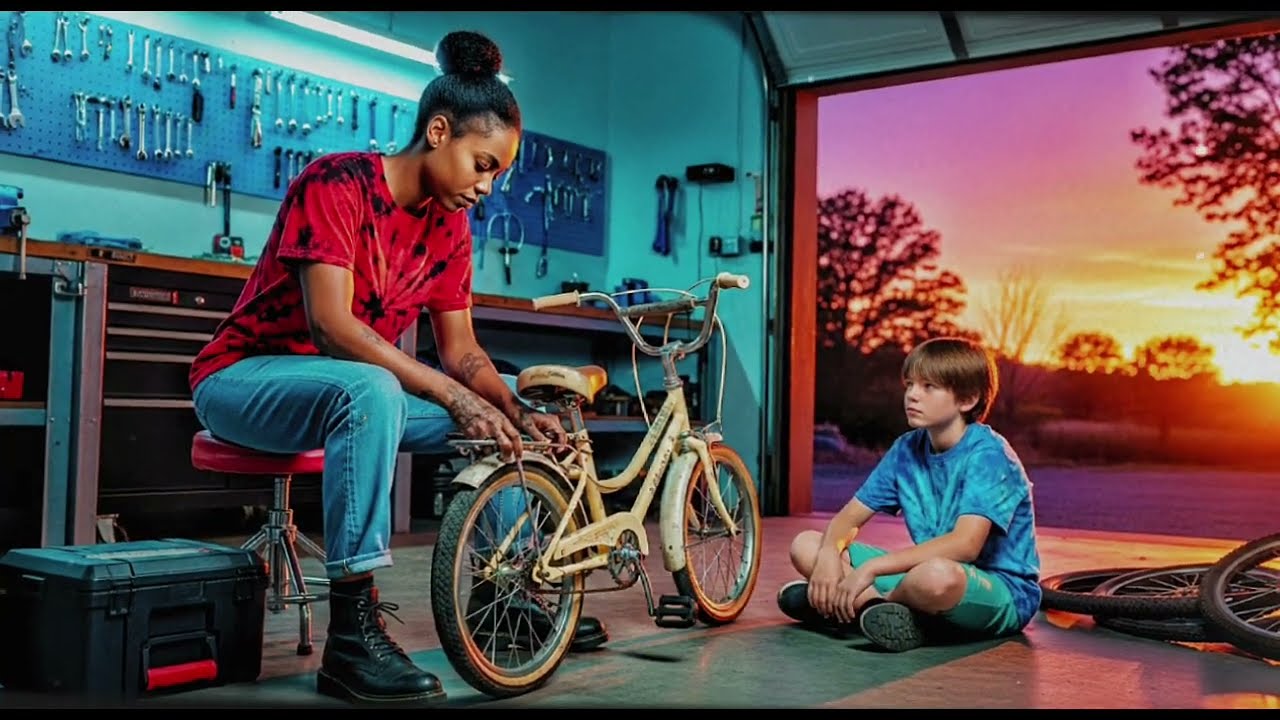 Without a second thought, she smiled and walked over. She crouched next to the bike, inspecting it carefully as the boy sat cross-legged on the floor, watching her every move. The golden light from the open garage door washed over them, her red shirt smudged with oil, her denim jeans stained from long hours, and the boy’s wide eyes reflecting the sunset.