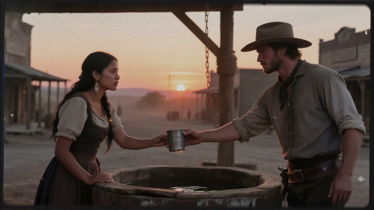 ” “Would you like a drink of water before you go on?” “None hesitated, her fingers tightening around the pale. I don’t want trouble,” she said. “Only water here,” he replied, lifting a tin cup from the wells edge. She stepped closer, took it from him. their fingers brushed, brief, accidental, but enough to set something trembling in the quiet.