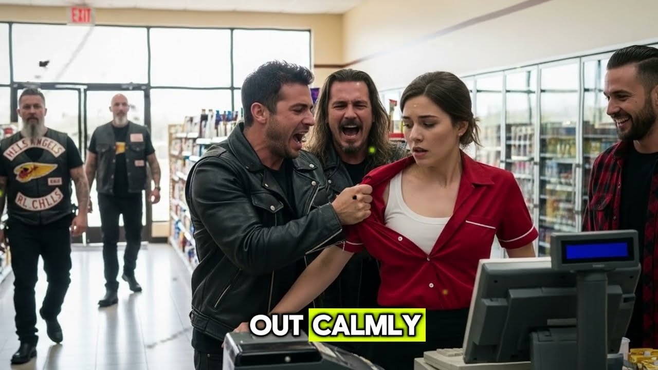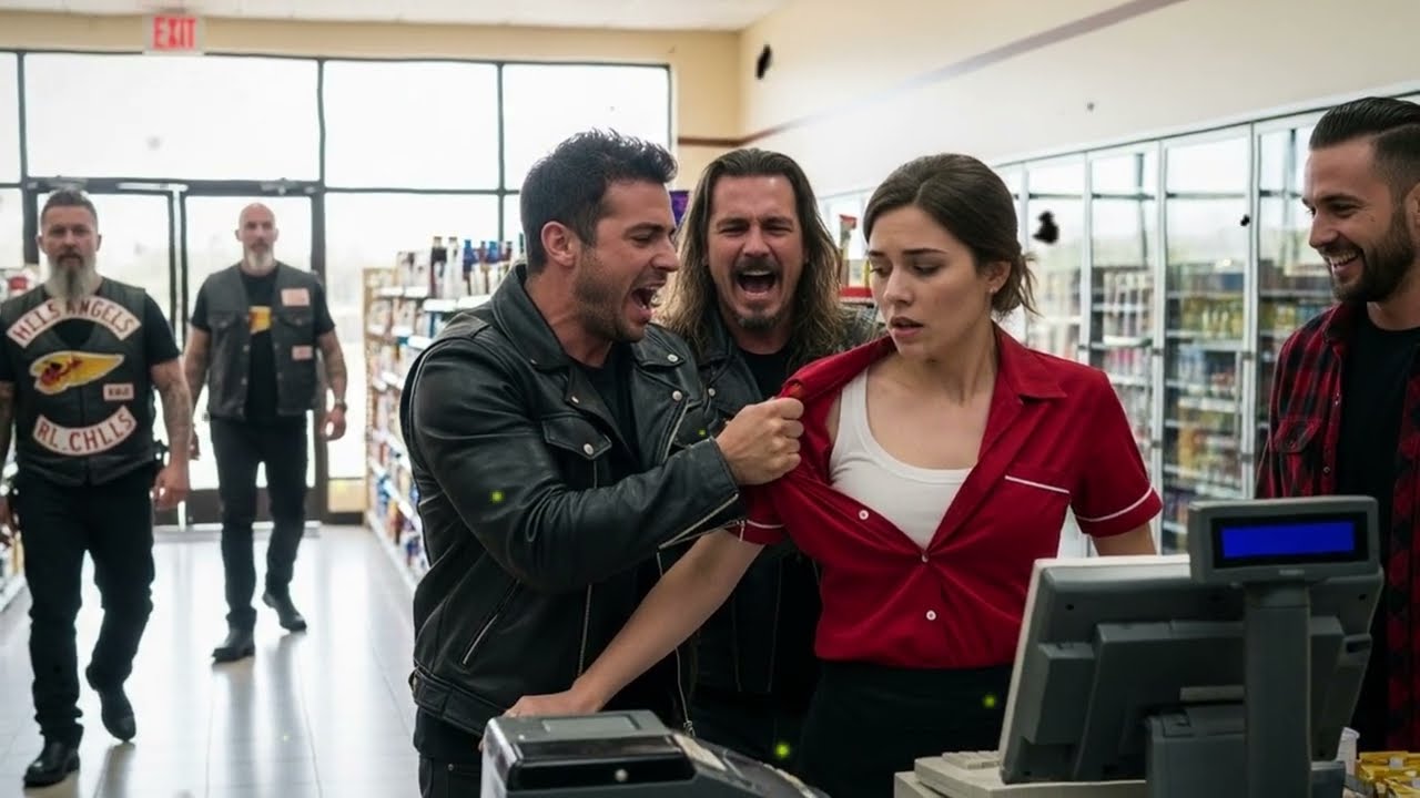 They looked like they had seen enough of the world to recognize trouble when it showed up. Mara stood frozen behind the counter, heart pounding as the bikers stopped a few steps away. The air between them and the gang was thick with silence. The leader’s eyes, cold yet calm, locked on Kyle’s hand, still gripping her torn shirt.