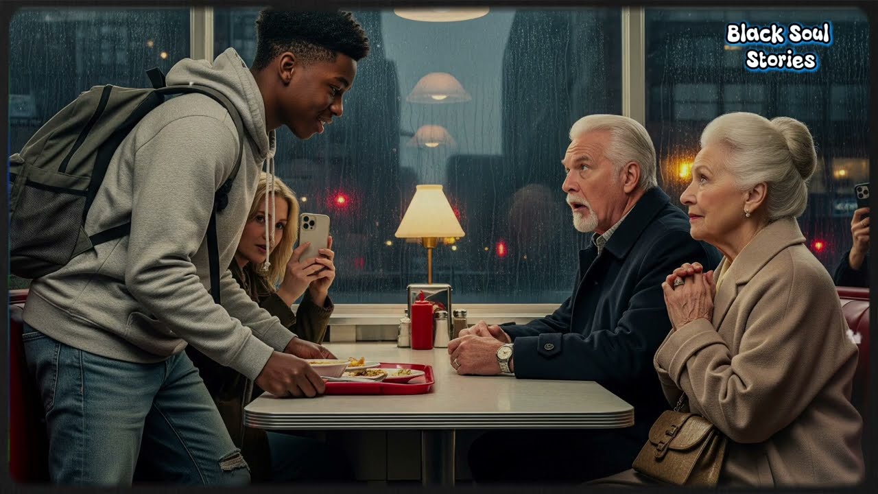 But as he reaches for his tray, something makes him stop. Table six. The corner booth is usually reserved for couples on dates or families celebrating birthdays. Tonight, it holds two figures who look completely out of place. An elderly white couple, both soaked to the bone. The woman’s silver hair drips steadily onto her designer coat.