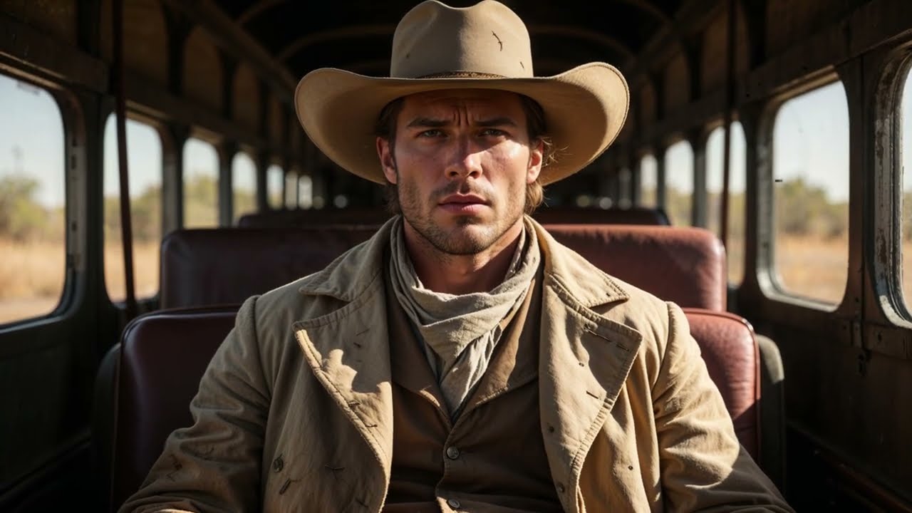 He wore a long tan duster coat, faded at the edges, but strong. It draped over his frame like a cloak built to weather dust storms and bullets alike. His hat shaded a square, sunworn face. His eyes, cold and unmoving, stared out the window at nothing in particular. He looked like a man who had stopped expecting things a long time ago.
