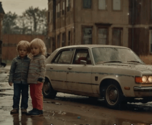 He saw them suddenly: two small, drenched figures on the roadside, standing near a car crumpled against a tree. The taller one, a boy named Roy, raised a weak, desperate arm. Beside him, the younger girl, Doris, clung tightly, her face buried in his shoulder. This wasn’t his business, he told himself, but the urgency in the boy’s second wave was a silent plea Lucas could not ignore.